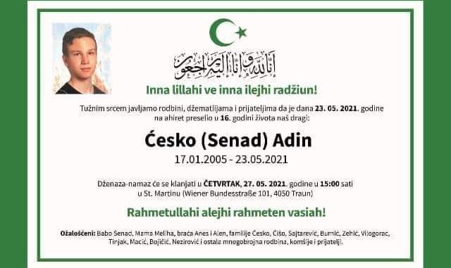 Tužnog srca i s bolom u duši obavještavamo rodbinu, komšije i prijatelje da je u nedjelju, 23.5.2021. godine u 16.godini života, Allahovom dž. š. odredbom, u Austriji na Ahiret preselio naš dragi Ćesko (Senad) Adin.
