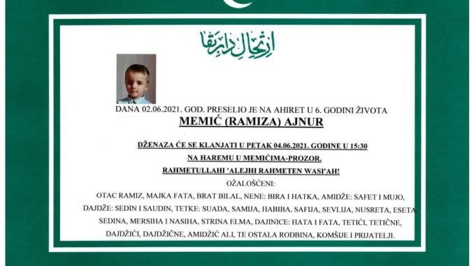 Tužnog srca i s bolom u duši obavještavamo rodbinu, komšije i prijatelje da je u srijedu, 2.6.2021. godine u 6.godini života, Allahovom dž. š. odredbom, na Ahiret tragično preselio naš dragi Memić (Ramiza) Ajnur.