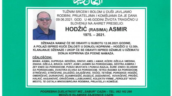 Tužnog srca i s bolom u duši obavještavamo rodbinu, komšije i prijatelje da je naš dragi Hodžić (Rasima) Asmir, dana 09.06.2021 godine, u 46-oj godini života, preselio na Ahiret.