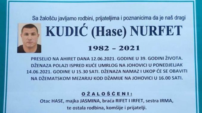 Tužnog srca i s bolom u duši obavještavamo rodbinu, komšije i prijatelje da je naš dragi Kudić (Hase) Nurfet, dana 12.06.2021. godine, u 39-toj godini života, preselio na Ahiret.