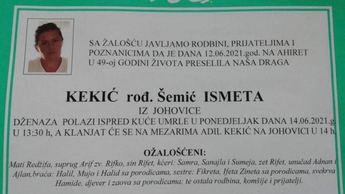 Tužnog srca i s bolom u duši obavještavamo rodbinu, komšije i prijatelje da je naša draga Kekić rođ. Šemić Ismeta, dana 12.06.2021. godine, u 49-toj godini života, preselila na Ahiret.