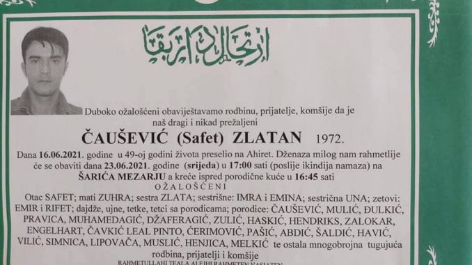 Tužnog srca i s bolom u duši obavještavamo rodbinu, komšije i prijatelje da je naš dragi Čaušević (Safet) Zlatan, dana 16.06.2021. godine, u 49-oj godini života, preselio na ahiret.