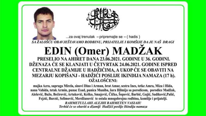 Tužnog srca i s bolom u duši obavještavamo rodbinu, komšije i prijatelje da je u srijedu, 23.6.2021. godine u 36.godini života, Allahovom dž. š. odredbom, na Ahiret preselio naš dragi Madžak (Omer) Edin.