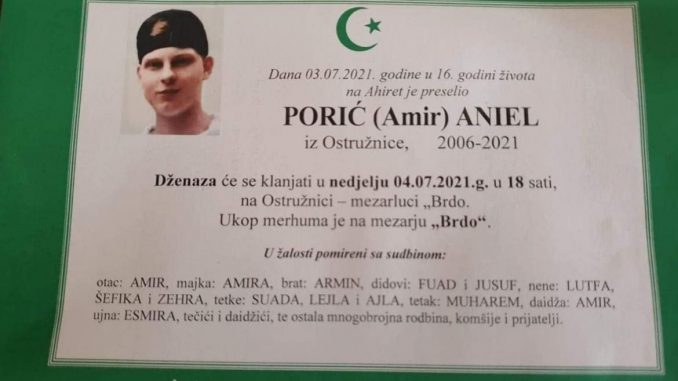 Tužnog srca i s bolom u duši obavještavamo rodbinu, komšije i prijatelje da je naš dragi Porić (Amir) Aniel, dana 03.07.2021. godine, u 16. godini života, preselio na ahiret.