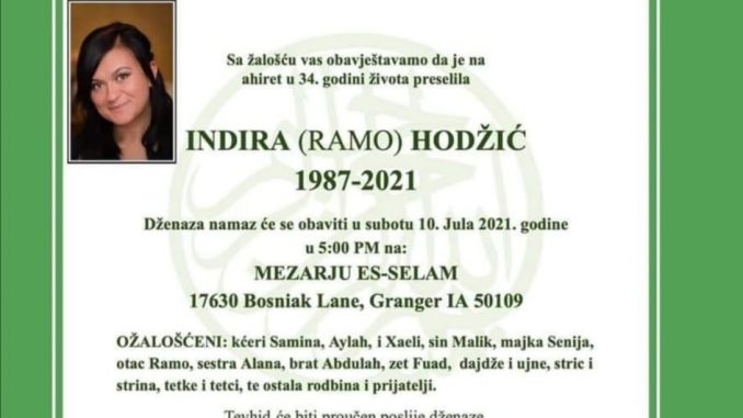 Sa žalošću vas obavještavamo da je na ahiret u 34. godini preselila Indira (Ramo) Hodžić.