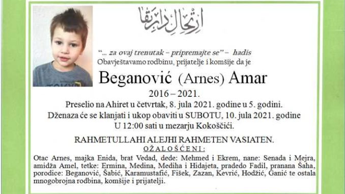 Tužnog srca i s bolom u duši obavještavamo rodbinu, komšije i prijatelje da je u četvrtak, 8.7.2021. godine u 5.godini života, Allahovom dž. š. odredbom, na Ahiret preselio naš dragi Beganović (Arnes) Amar.