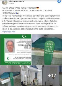 “Rahm. Enes Hans-Jörg Fridrich rodio se u Njemačkoj u kršćanskoj porodici, tako se i odškolovao i odrãstao sve dok se nije upoznao i oženio sa jednom muslimankom iz Gornjeg Vakufa. Sa njom u braku je prihvatio i vjeru Islam. Zadivljen postulatima vjere Islama i onim sto ova vjera objašnjava šta se dešava sa insanom nakon njegove smrti, napisao je i testament u kojem je o/poručio da posle njegove smrti, bude po islamskim propisima ukopan u Bosni, tačnije u mezarju džemata Duratbegović Dolac, MIZ G. Vakuf, gdje su ga mnoge džematlije tog kraja, samo po dobru poznavali”, napisao je ef. Ahmetović.