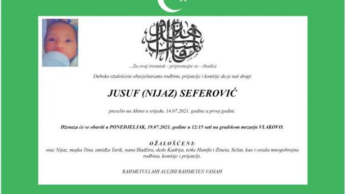 Tužnog srca i s bolom u duši obavještavamo rodbinu, komšije i prijatelje da je u srijedu, 14.7.2021. godine u 1.godini života, Allahovom dž. š. odredbom, na Ahiret preselio naš dragi Seferović (Nijaz) Jusuf.