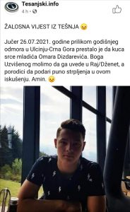 “Jučer 26.07.2021. godine prilikom godišnjeg odmora u Ulcinju-Crna Gora prestalo je da kuca srce mladića Omara Dizdarevića. Boga Uzvišenog molimo da ga uvede u Raj/Dženet, a porodici da podari puno strpljenja u ovom iskušenju. Amin”, naveli su na stranici Tesanjski.info.