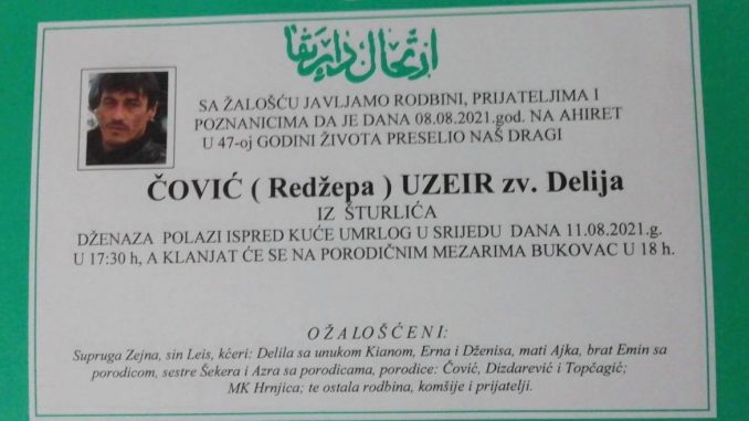 Tužnog srca i s bolom u duši obavještavamo rodbinu, komšije i prijatelje da je naš dragi Čović (Redžepa) Uzeir, dana 08.08.2021 godine, u 47-oj godini života, preselio na Ahiret.