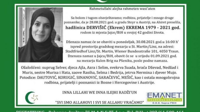 Tužnog srca i s bolom u duši obavještavamo rodbinu, komšije i prijatelje da je naša draga Dervišić (Ekrem) Ekrema, dana 28.08.2021. godine, u gradu Steyr u Austriji, u 42-oj godini života, preselila na Ahiret.
