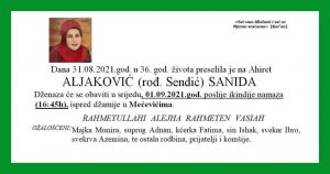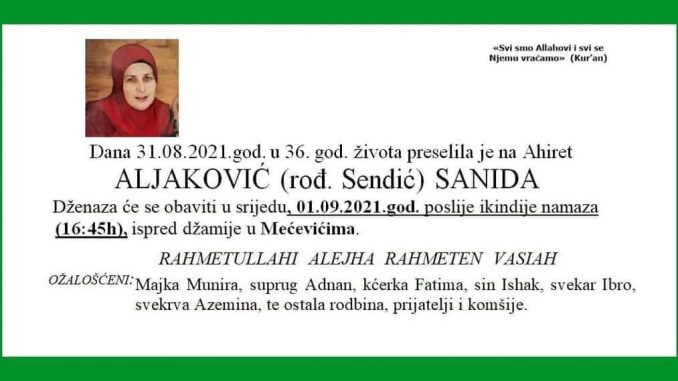 Sanida Aljaković preminula je u 36. godini života, a iza nje su ostali neutješni članovi porodice, prijatelji i poznanici. Ovu vijest podijelili su građani putem društvenih mreža, a jedan od njih je i Šemsudin Mehmedović, poslanik u Parlamentu BiH. Sa sedam godina ostala je siroče, bez oca, živjela skromno, čestito kako jetim može, ostavi iza sebe dva siročića, majku koja je osjetila svu tugu ovog svijeta.