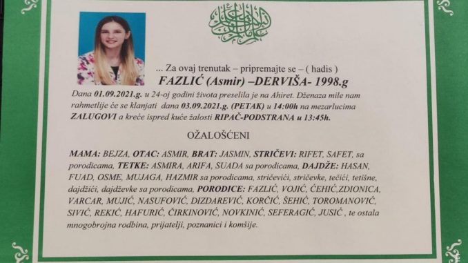 Tužnog srca i s bolom u duši obavještavamo rodbinu, komšije i prijatelje da je naša draga Fazlić (Asmir) Derviša, dana 01.09.2021. godine, u 24-oj godini života, preselila na Ahiret.