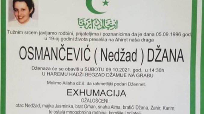 Tužnog srca i s bolom u duši obavještavamo rodbinu, komšije i prijatelje da je naša draga Osmančević (Nedžad) Džana, dana 05.09.1996. godine, u 19-oj godini života, preselila na Ahiret.