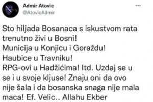 Brojne reakcije izazvao je status konzula BiH u Frankfurtu, Admira Atovića, u kojem se spominju municija iz Konjica i Goražda i haubice iz Travnika, uz podatak da u BiH živi 100.000 Bosanaca sa iskustvom rata i tekbir. Status je protumačen kao poziv na rat, pa se Atović našao na meti kritika, a službeno izjašnjenje od njega je zatražilo i Ministarstvo vanjskih poslova BiH.
