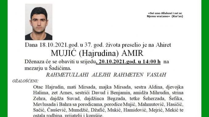Dženaza namaz će se klanjati i ukop obaviti u srijedu 20.10.2021. godine, u 14:00h na mezarju u Šadićima.