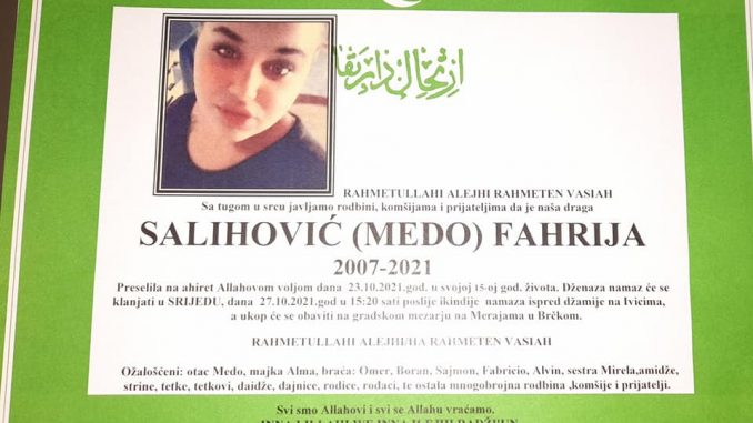 Dženaza namaz će se klanjati u srijedu, dana 27.10.2021. godine, u 15:20h poslije ikindije namaza, ispred džamije na Ivicima a ukop će se obaviti na Gradskom mezarju na Merajama u Brčkom.