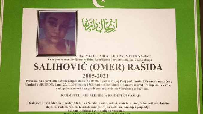 Dženaza namaz će se klanjati u srijedu, dana 27.10.2021. godine, u 15:20h poslije ikindije namaza, ispred džamije na Ivicima a ukop će se obaviti na Gradskom mezarju na Merajama u Brčkom.