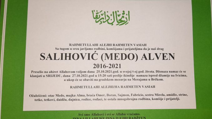 Dženaza namaz će se klanjati u srijedu, dana 27.10.2021. godine, u 15:20h poslije ikindije namaza, ispred džamije na Ivicima a ukop će se obaviti na Gradskom mezarju na Merajama u Brčkom.