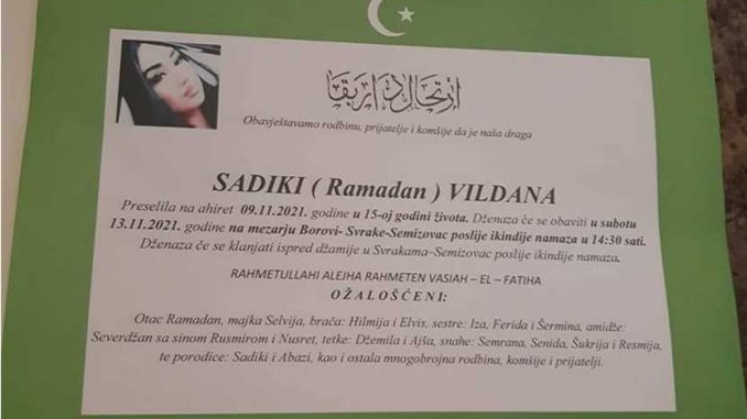 Danas je klanjana dženaza djevojčici Sadiki Vildani koja je preminula u 15-toj godini života na mezarju Borovi-Svrake-Semizovac.