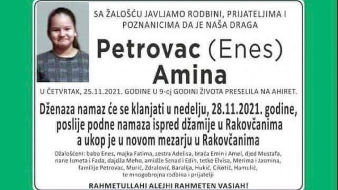 Tužnog srca i s bolom u duši obavještavamo rodbinu, komšije i prijatelje da je naša draga Petrovac (Enes) Amina dana 25.11.2021. u 9. godini života preselila na ahiret.