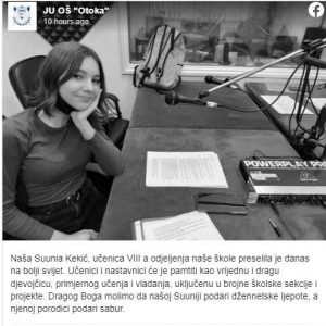 – Naša Suunia Kekić, učenica VIII a odjeljenja naše škole preselila je danas na bolji svijet. Učenici i nastavnici će je pamtiti kao vrijednu i dragu djevojčicu, primjernog učenja i vladanja, uključenu u brojne školske sekcije i projekte. Dragog Boga molimo da našoj Suuniji podari džennetske ljepote, a njenoj porodici podari sabur – objavili su iz škole Bosanska Otoka.