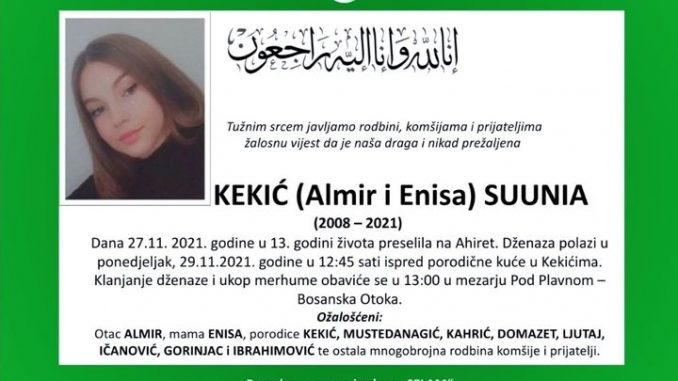 Dženaza namaz će se obaviti u ponedjeljak, 29. novembra 2021. godine u 12:45h ispred porodične kuće u Kekićima. Klanjanje dženaze i ukop merhume obaviće se u 13:00h u mezarju Pod Plavnom – Bos. Otoka.
