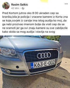 “Čovjek je iz čaršije, ima istog audija ko moj… da ga ne bi prozivao imenom bolje da vrati čep, da se ne sramoti jer ga svi znaju, kamere su sve zabilježile kako skida sa mog audija i stavlja na svog”- objavio je razočarani sugrađanin, uz sliku svoga automobila sa registarskim tablicama.
