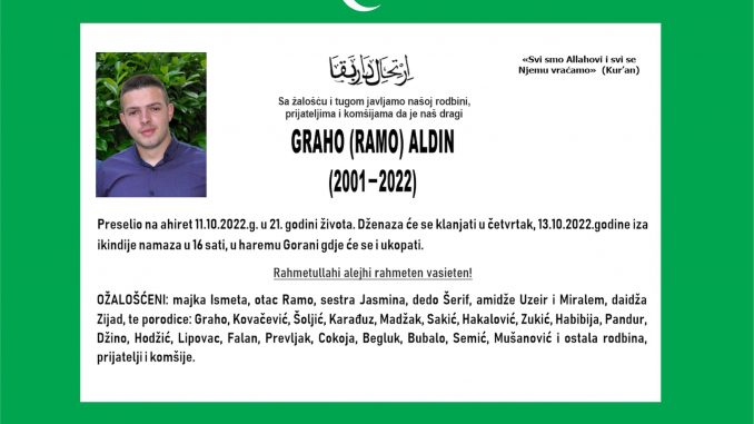 Tužnog srca i s bolom u duši obavještavamo rodbinu, komšije i prijatelje da je u utorak, 11.10. 2022. u 21. godini života, Allahovom dž. š. odredbom, na Ahiret tragično preselio naš dragi Graho (Ramo) Aldin.