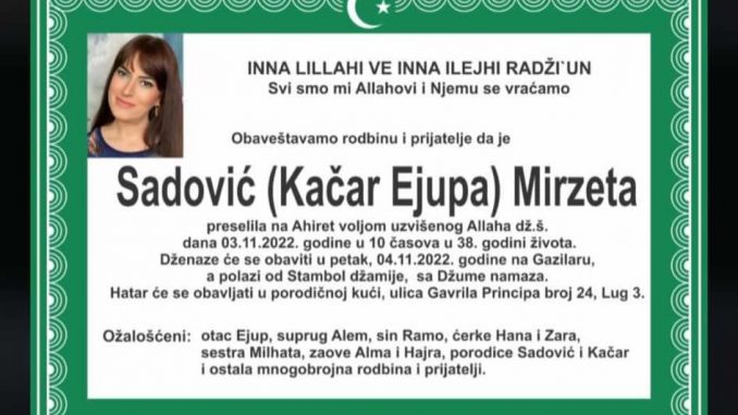 Tužnog srca i s bolom u duši obavještavamo rodbinu, komšije i prijatelje da je naša draga Sadović (Ejupa) Izeta preselila na Ahiret 3.11. 2022. godine u 38. godini života.