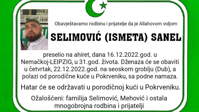 Tužnog srca i s bolom u duši obavještavamo rodbinu, komšije i prijatelje da je naš dragi Selimović (Ismeta) Sanel Allahovom dž. odrebom preselio na Ahiret 16.12.2022. godine u 31. godini života u Njemačkoj – Leipzig.