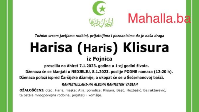 Na Ahiret preselila Harisa Klisura u 1. godini života