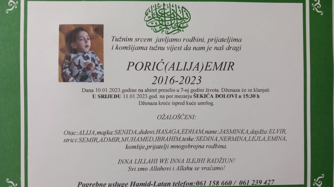 Tužnim srcem obavještavamo rodbinu, prijatelje i poznanike da je dana 10.1.2023. godine u 7. godini života Allahovom dž. odredbom ona ahiret preselio naš dragi Porić (Alija) Emir.