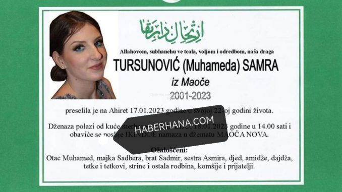 Tužnim srcem obavještavamo rodbinu, prijatelje i poznanike da je dana 17.1.2023. godine u 22. godini života Allahovom dž. odredbom ona ahiret preselila naša draga Tursunović (Muhameda) Samra.