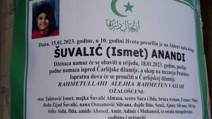 Na zeničkom mezarju Prašnice danas će biti obavljen ukop Anandi Šuvalić, 10-godišnje djevojčice koja je u nedjelju preminula od meningitisa. Dženaza namaz će se klanjati u Čaršijskoj džamiji u Zenici.