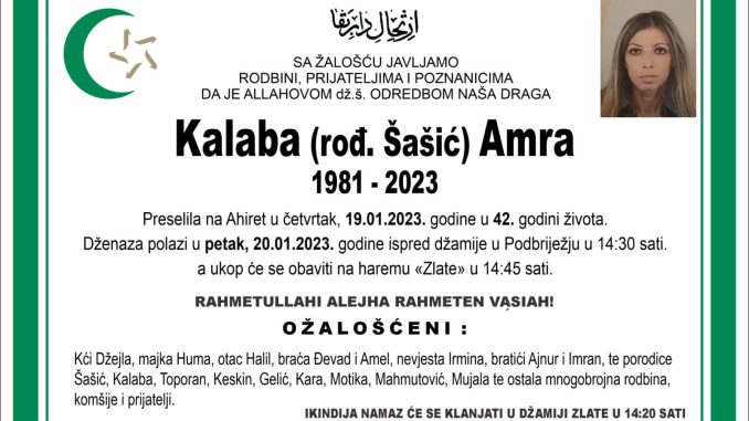 Tužnim srcem obavještavamo rodbinu, prijatelje i poznanike da je u četvrtak, 19.1.2023. godine u 42. godini života Allahovom dž. odredbom ona ahiret preselila naša draga Kalaba (rođ. Šašić) Amra.