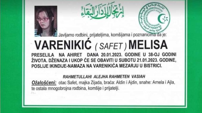 Tužnim srcem obavještavamo rodbinu, prijatelje i poznanike da je u petak, 20.1.2023. godine u 38. godini života Allahovom dž. odredbom na ahiret preselila naša draga Varenikić (Safet) Melisa.
