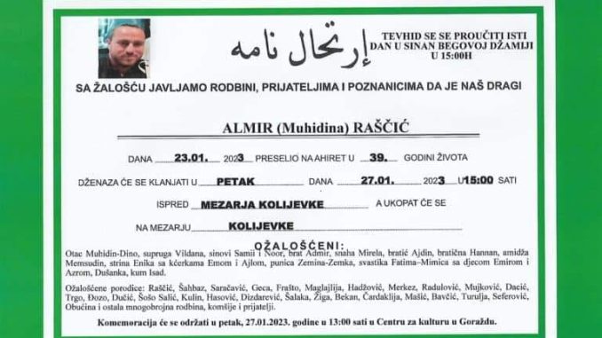 Tridesetdevetogodišnji Almir Rašćić preminuo je od posljedica povreda zadobijenih u napadu 13. januara kada je, u momentu dok se kretao prema automobilu na parkingu stambene zgrade gdje je živio, upucan u glavu.