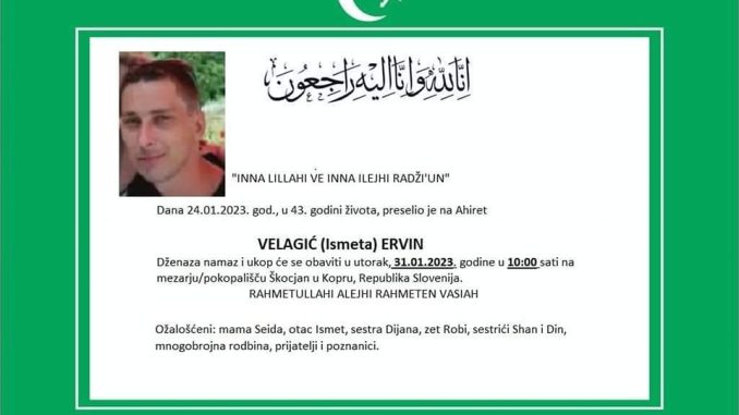 Dženaza namaz i ukop će se obaviti u utorak, 31.01.2023. godine u 10:00 sati na mezarju Škocjan u Kopru, Republika Slovenija.