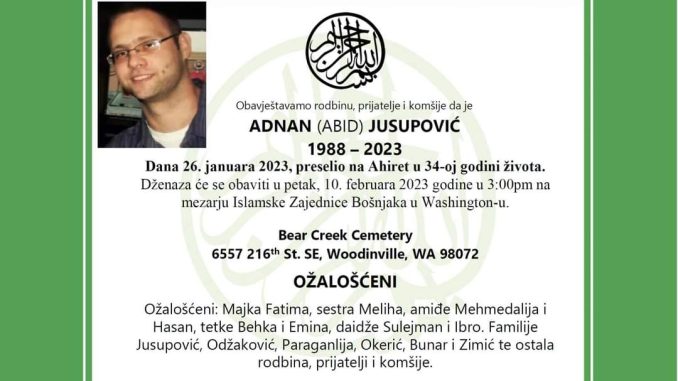 Tužnim srcem javljamo rodbini, prijateljima i poznanicima žalosnu vijest da nam je 26.1.2023. u 34. godini života na Ahiret preselio naš dragi Adnan (Abid) Jusupović.