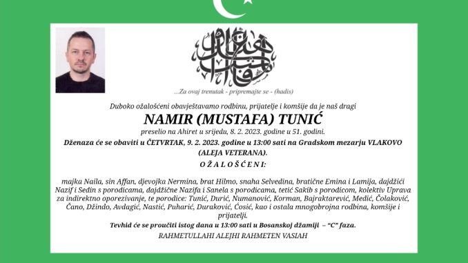 Tužnim srcem obavještavamo rodbinu, prijatelje i poznanike da je u srijedu, 8.2.2023. godine u 51. godini života Allahovom dž. odredbom ona ahiret preselio naš dragi Tunić (Mustafa) Namir.