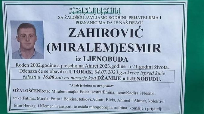 Tužnim srcem obavještavamo rodbinu, prijatelje i poznanike da je u četvrtak, u 21. godini života Allahovom dž. odredbom na ahiret preselio naš dragi Zahirović (Miralem) Esmir.
