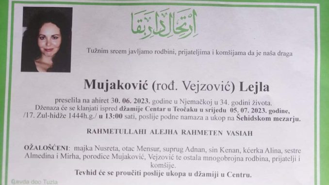Tužnim srcem obavještavamo rodbinu, prijatelje i poznanike da je u petak 30.6.2023. godine, u 34. godini života Allahovom dž. odredbom na ahiret preselio naša draga Mujaković rođ. Vejzović Lejla.