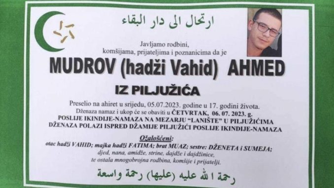 “Tešanj tuguje… Ahmed Mudrov, mladić od 17 godina juče je preselio u slijetanju skutera. Dolazi iz porodice koju mnogi znaju po poštenom radu, moralu i koristi za zajednicu.