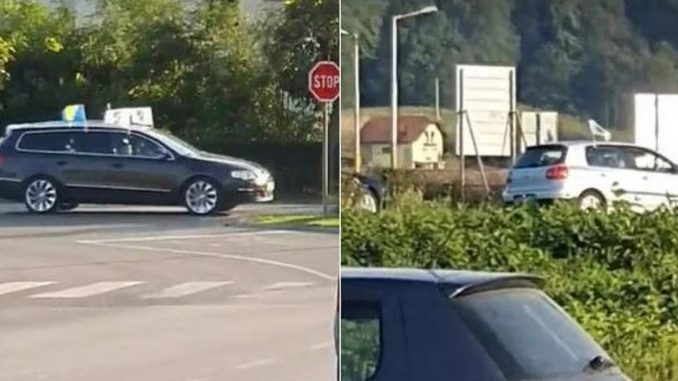 Na snimku iz Doboja koji posjeduje Klix.ba, može se vidjeti kako dva automobila sa spomenutim zastavama odlaze u pratnji policije.