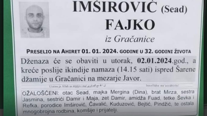 Dženaza Fajki Imširoviću koji je poginuo jučer u stravičnoj nesreći u Stjepan Polju obavit će se danas poslije ikindije namaza u 14:15 sati ispred Šarene džamije u Gračanici, a ukop će se obaviti na mezarju “Javor”.