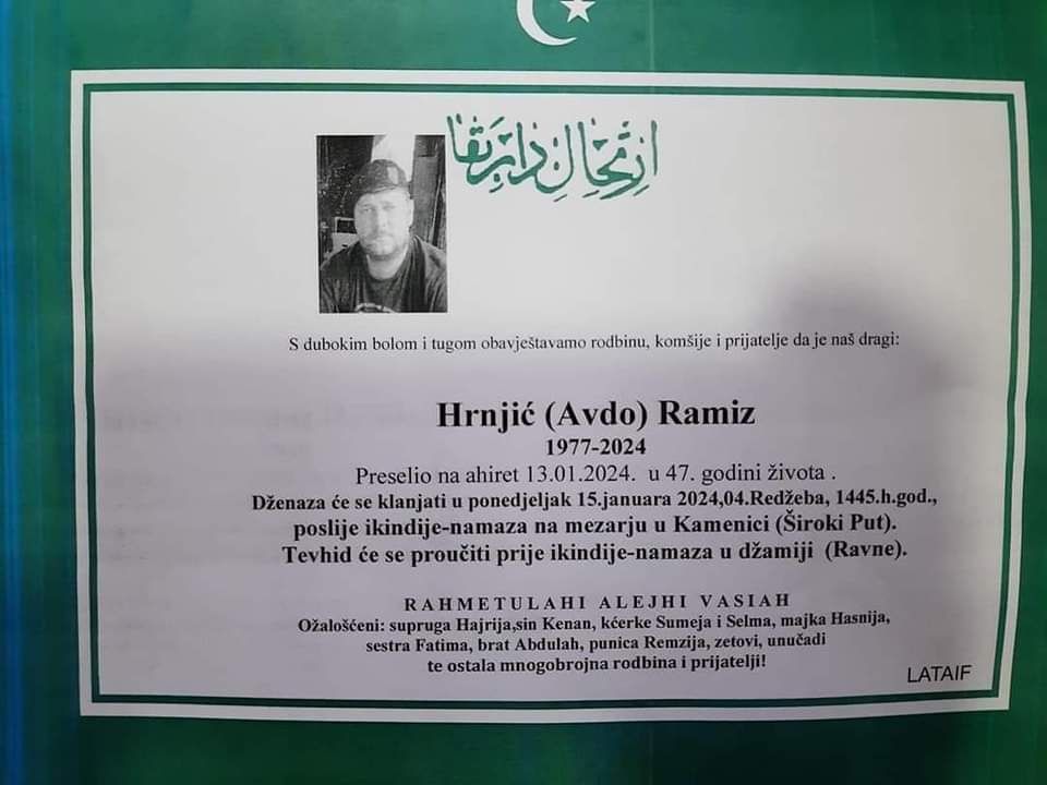 Preselio na ahiret 13.01.2024. u 47. godini života. Dženaza će se klanjati u ponedjeljak 15.januara 2024,04.Redžeba, 1445.h.god.,