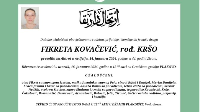 Dženaza će se obaviti u utorak, 16. januara 2024. godine u 12 45 sati na Gradskom groblju VLAKOVO.