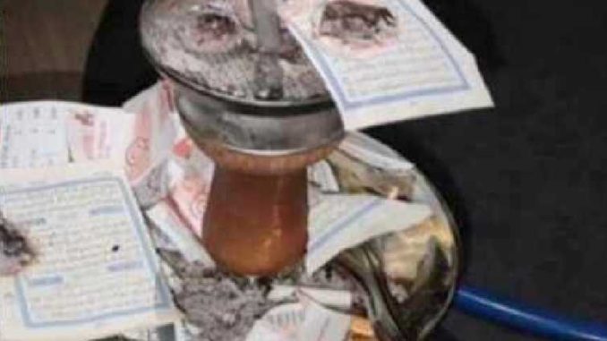 Na sramnoj fotografiji mladići su palili stranice svete muslimanske knjige na vodenoj luli odnosno nargili. Stranice su stavljali na žar koji se nalazi na nargili.