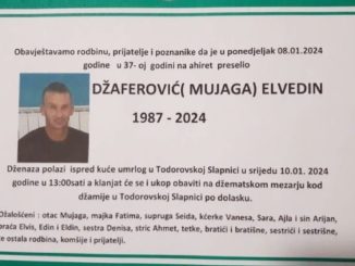 Obavještavamo rodbinu, prijatelje i poznanike da je u ponedjeljak 08.01.2024 godine u 37-oj godini na ahiret preselio DŽAFEROVIĆ( MUJAGA) ELVEDIN 1987-2024 Dženaza polazi ispred kuće […]